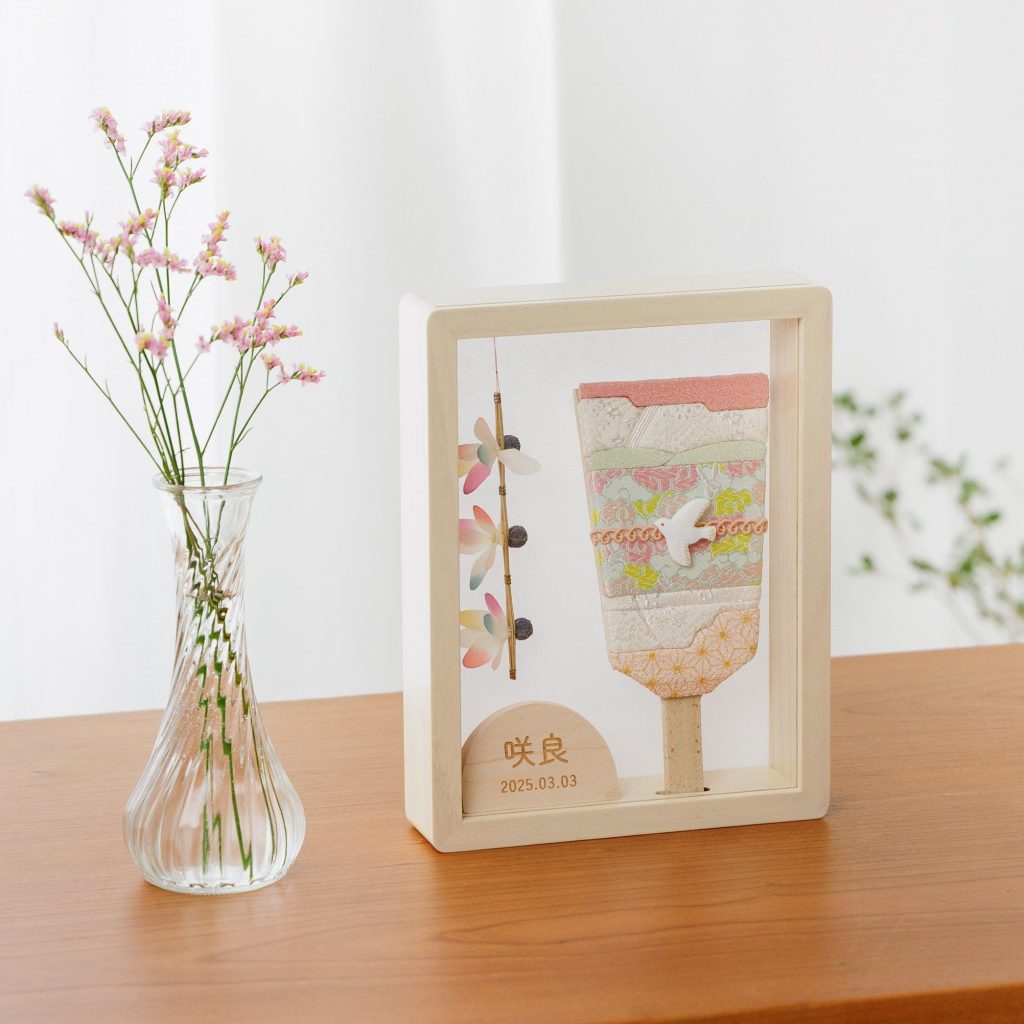 木製ボックスフレームの中に、やさしい雰囲気の羽子板と飾り羽根が詰まったセットです。