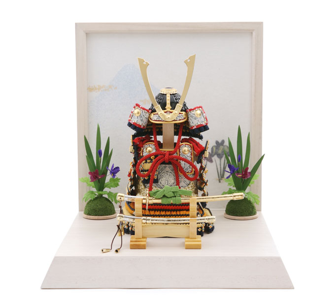 兜や鎧に「魔除け」の赤色を取り入れた、コンパクトながらも力強さを感じられる鎧飾です。重厚感のある配色がナチュラルな白木の台とお屏風によってより一層引き立ち、端午の節句のお祝い感あふれる空間を演出できます。
