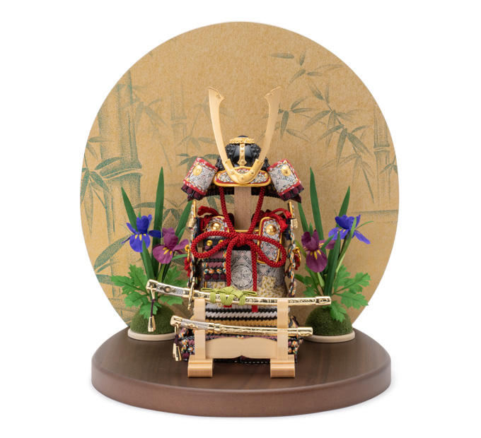 繊細なつくりの鎧兜に太刀と菖蒲飾りを添えた、コンパクトながらも本格的な鎧飾です。紫を基調とした鎧が何ともおしゃれで、ブラウンの台屏風との組み合わせによって上品な雰囲気に仕上げました。