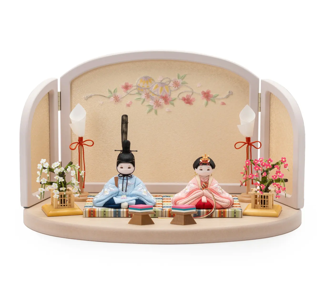 注目ポイントはお衣装に施された白梅の刺繍。梅は春の訪れを告げる花であることから、「春告草」と言われています。また、お屏風にも、「円満」の意味を持つまり柄や桜柄が刺繍で施され、柔らかで温かな春を感じさせるモチーフを散りばめました。感性豊かなお顔のそよそよちゃんに合わせた、優しい印象の雛人形です。