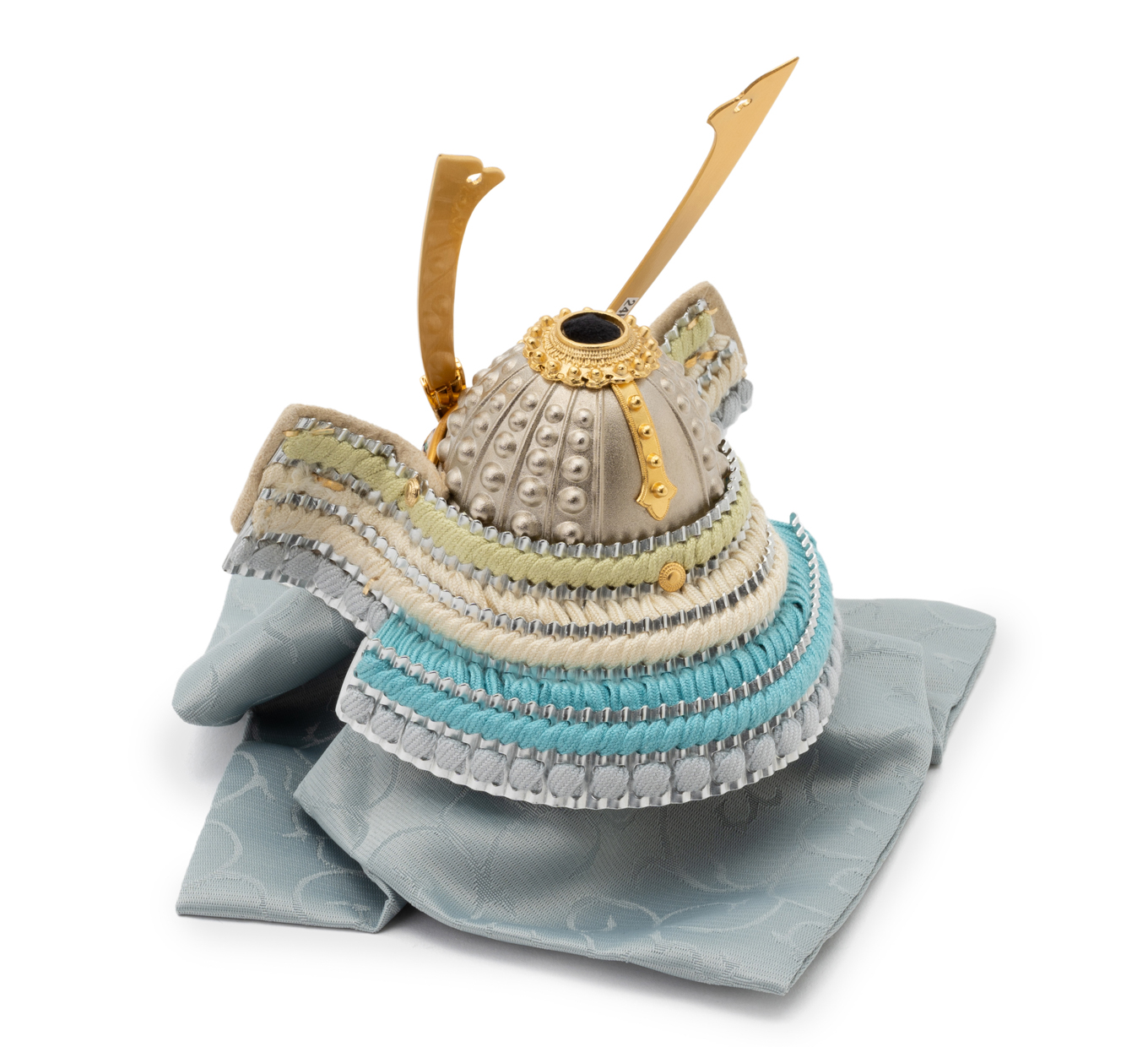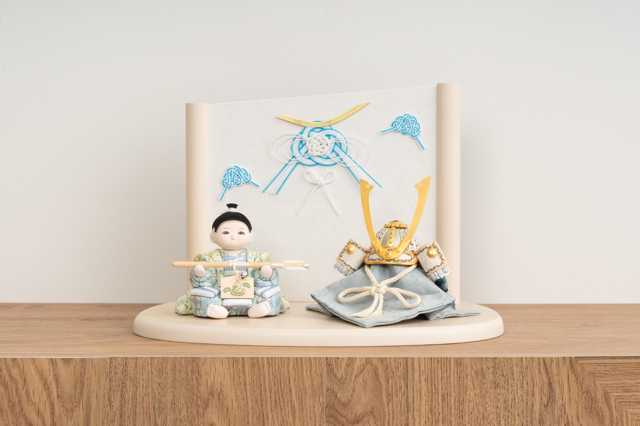 お屏風に飾られた、水引でできた爽やかな水色の兜がとてもおしゃれです。