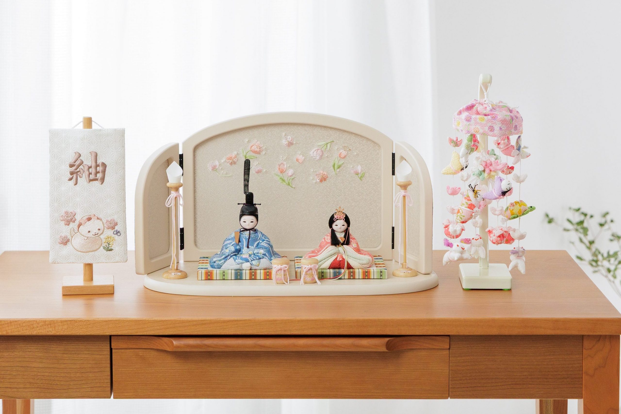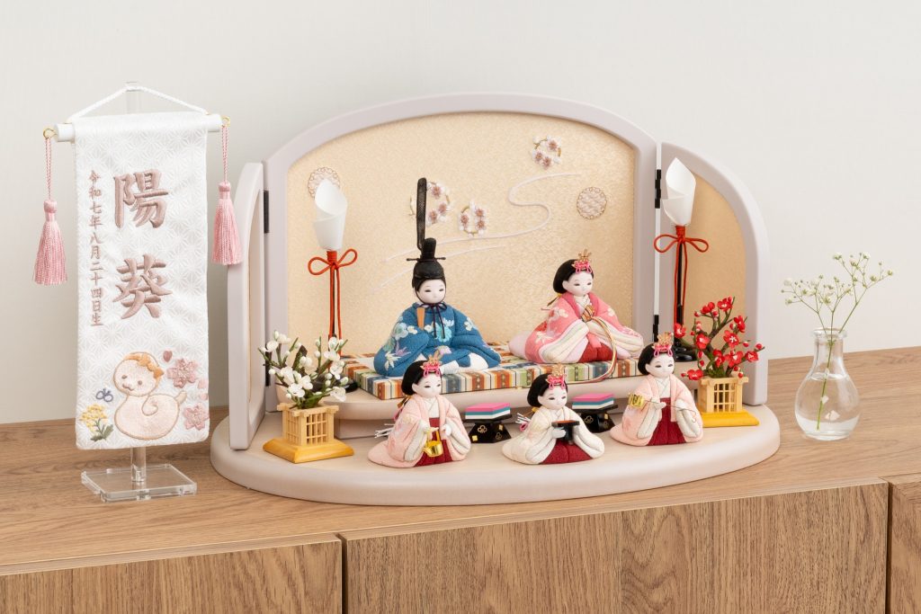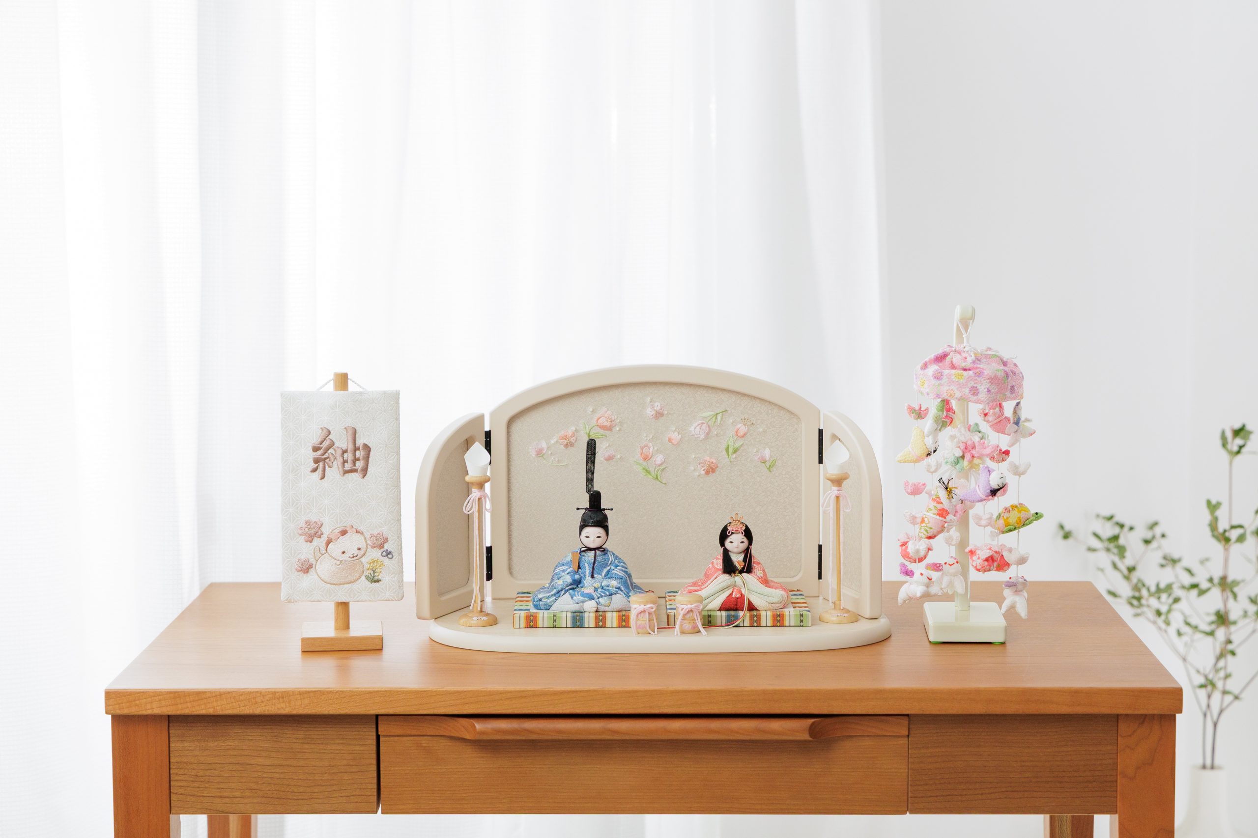 主張しすぎない色合いでコーディネートされたセットですので、オプション飾のお名前旗やつるし飾り、クロス、雛道具など、お好きなものを組み合わせて自分好みの雛人形にアレンジしてお飾りいただくことができます。