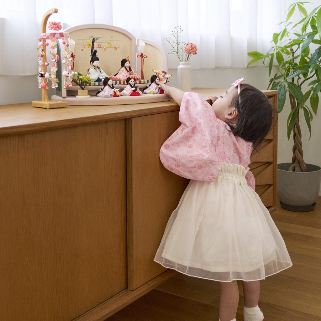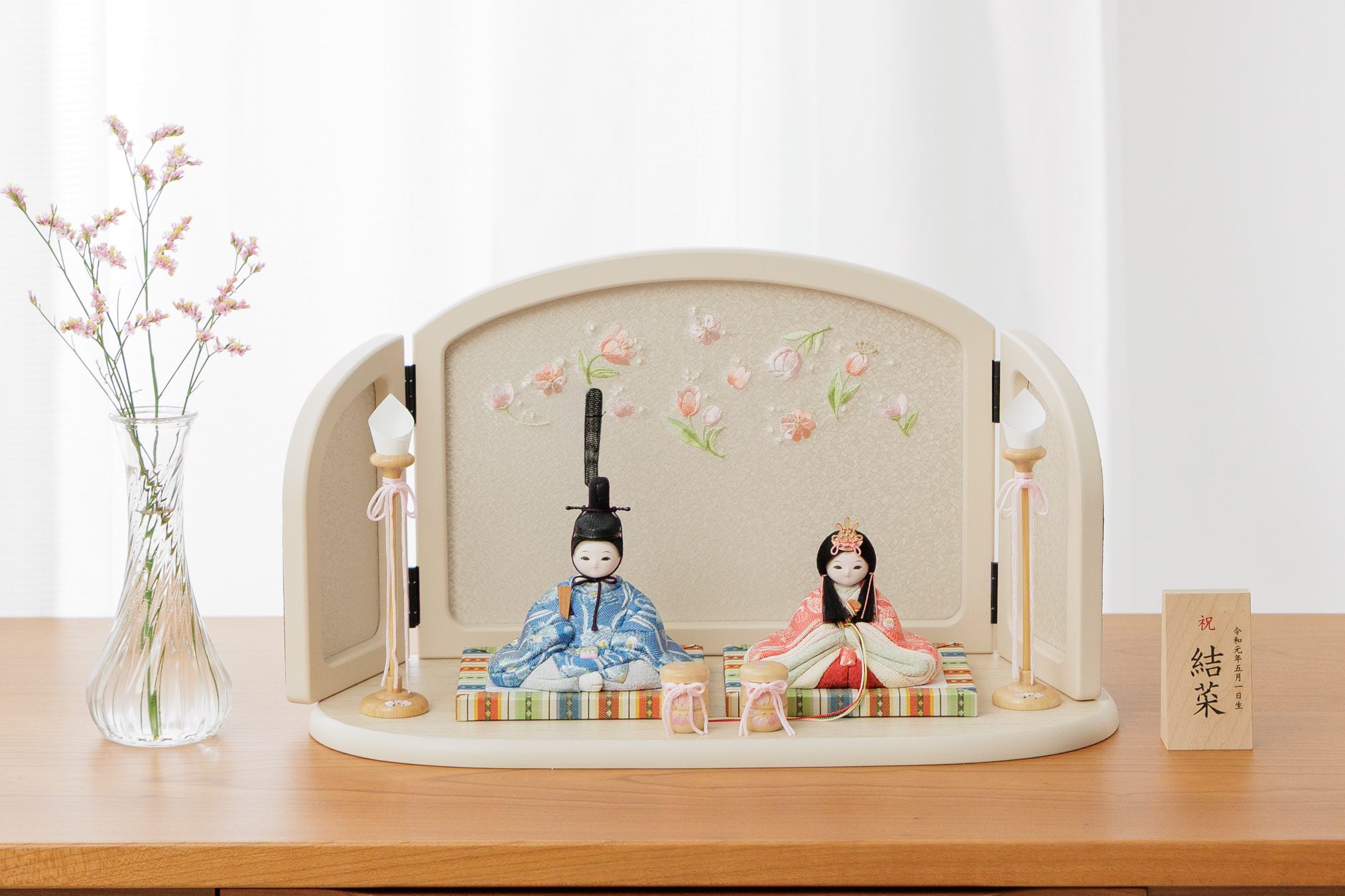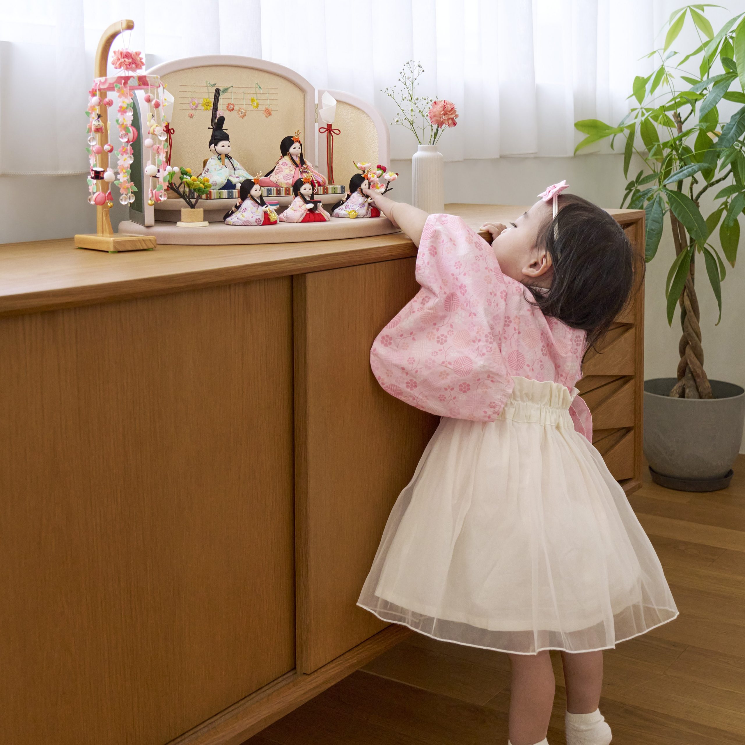主張しすぎない色合いでコーディネートされたセットですので、オプション飾のお名前旗やつるし飾り、クロス、雛道具など、お好きなものを組み合わせて自分好みの雛人形にアレンジしてお飾りいただくことができます。