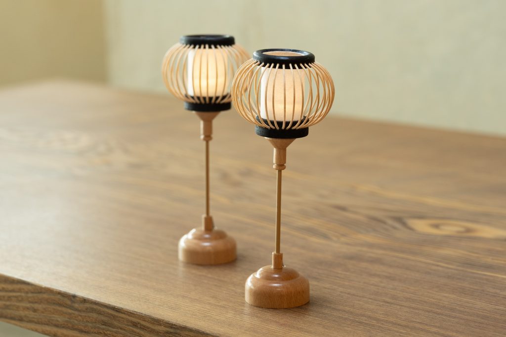 伝統工芸品である駿河竹千筋細工を使用した点灯式の燭台。繊細なつくりとやわらかな灯りが美しく、お人形をやさしく照らしてくれます。