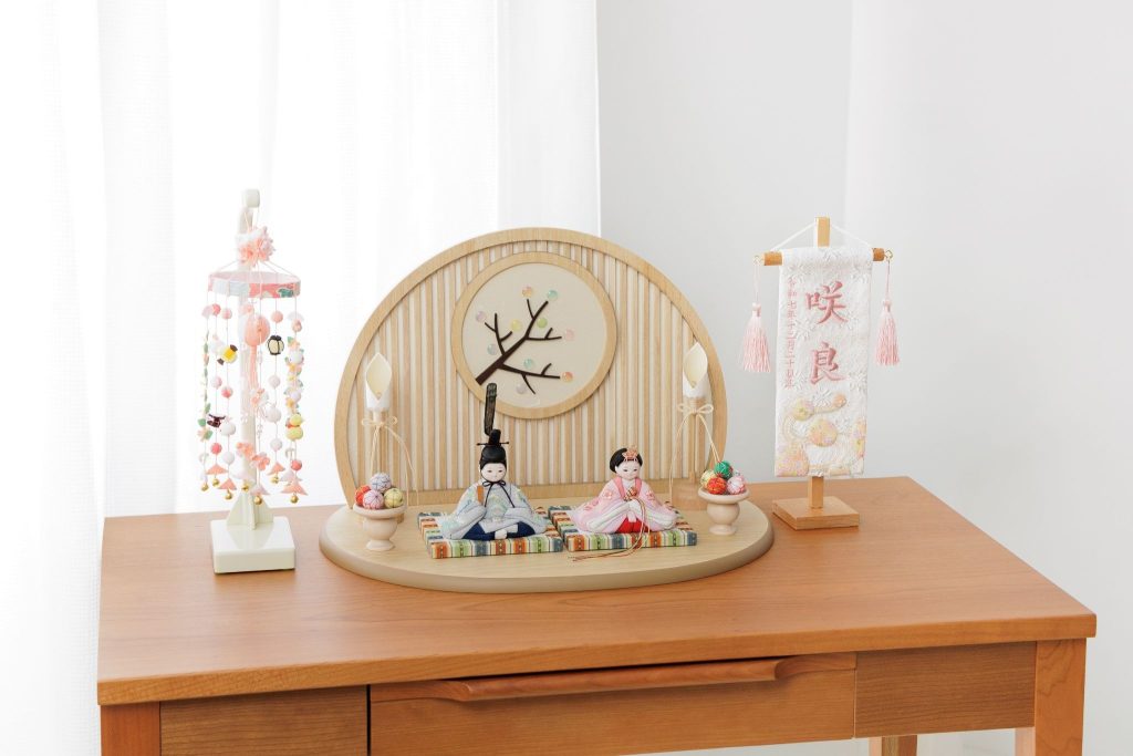 平飾りは段飾りと違い、お人形以外の飾り台や屏風のデザインが際立つのが特徴です。木目調、和紙を使ったナチュラルなものまで種類も豊富で、お部屋のインテリアや好みに合わせて選ぶ楽しみがあります。