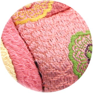 布の表面に地紋を織り出した紋織物。肌ざわりがなめらかで美しい光沢があり、振袖や訪問着に用いられる織物です。