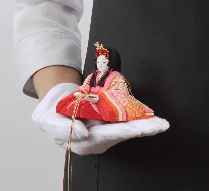 縁起の良い「七宝(しっぽう)」柄のお衣装。七宝とは、仏教の言葉で“この上もなく美しく貴重な宝物”のこと。この吉祥文様(きっしょうもんよう)のお衣装を、女雛も男雛も三人官女もみんな仲よくお揃いで着せました。優しいお顔が見る人の心をほのぼの温めてくれる、味わい深い雛人形。我が子を囲むひな祭りの楽しい語らいを、いっそう盛り上げてくれることでしょう。