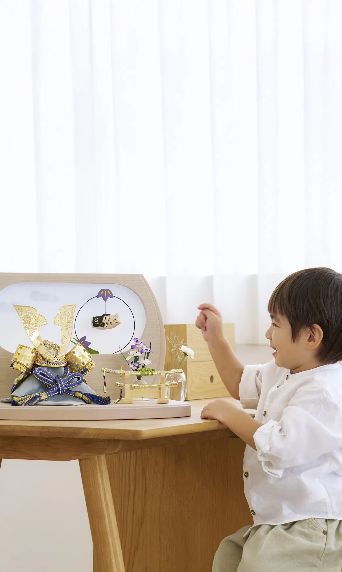 型染め和紙の鯉のぼり屏風が、印象的な彩り。白木調の台座はお部屋になじみ、上品に飾れます。菖蒲文様のぼんぼりは岐阜の職人が一つひとつ丁寧に仕立てた逸品。灯りをともして、あたたかなお節句を。