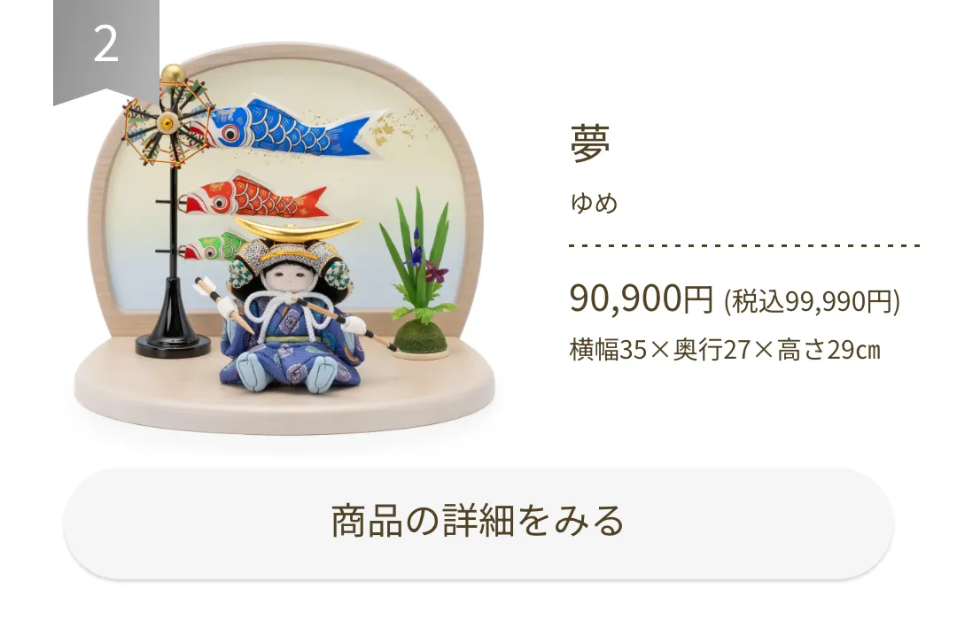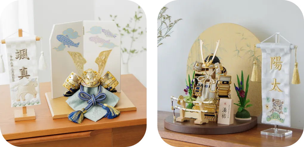 2タイプの五月人形優しいデザインや色合いなど、かっこよさと可愛らしさの “ちょうど良い” バランスが人気の秘密です。