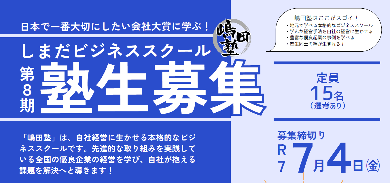 「嶋田塾」は、先進的な取り組みを実践している全国の優良企業の経営を学び、自社が抱える課題を解決へと導く、自社経営に活かせる本格的なビジネススクールです。